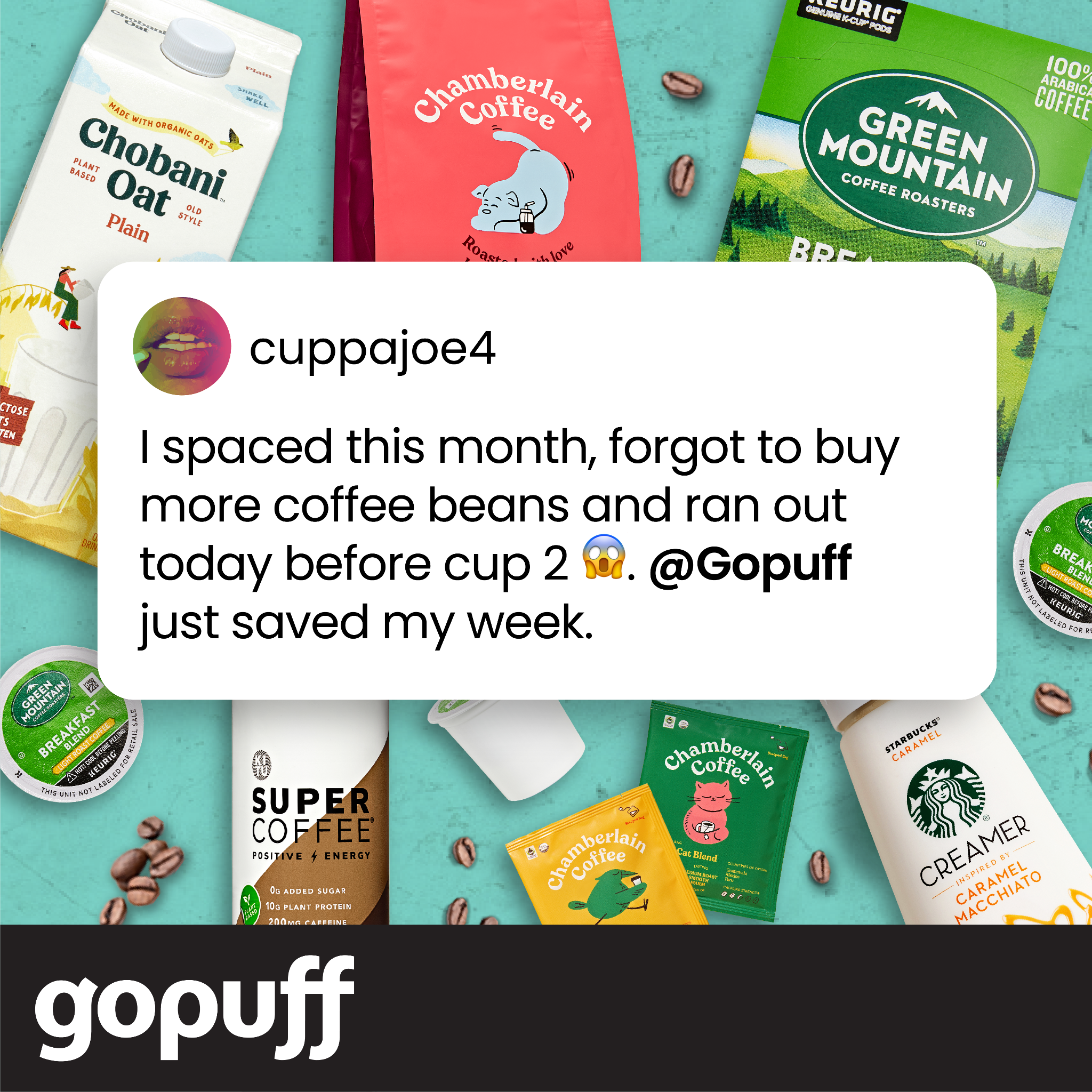Paid social media advertisement framing Gopuff as the solution to running out of coffee. Written to feel like user-generated content rather than a polished ad to fit in with the social media platforms it ran on (Twitter, Facebook, Instagram and Snapchat).